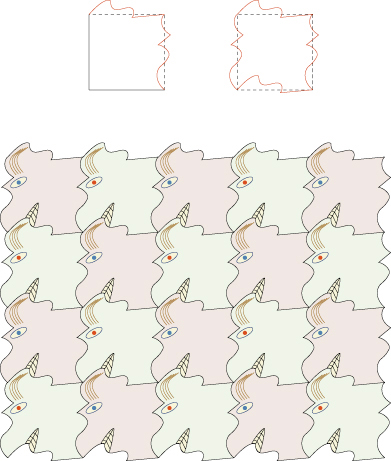 This same process can be applied to a square when two adjacent sides are changed. Start with a square and change two adjacent sides, trace the changes and translate these changes to the opposite sides as shown below. Form the tessellation by tracing this shape at least 12 times and shade or color alternating shapes.