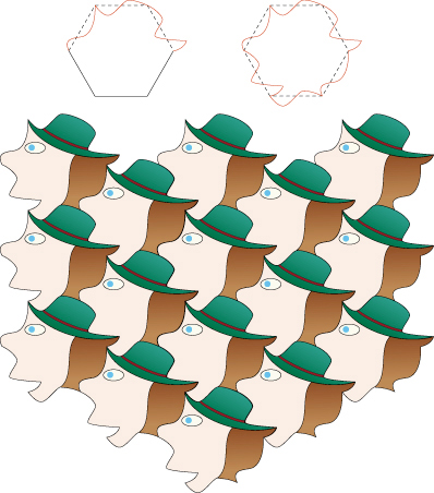 This same process can be applied to a hexagon when three adjacent sides are changed. Start with a hexagon and change three adjacent sides, trace the changes and translate these changes to the opposite sides as shown below. Form the tessellation by tracing this shape at least 18 times and shade or color alternating shapes. In this case, several internal features were added.