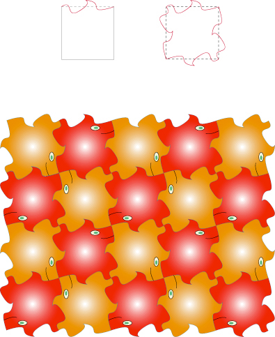 A translation is a movement is a specific direction, without turning or reflecting. Use a tessellation tracer to draw a square, make a change to one of its sides and use tracing paper to copy the modified square. Slide the original paper so that the change is translated to the opposite side and copy it, as shown below right. Use a new sheet of tracing paper to copy this shape until at least 12 shapes are traced. Shade or color the tessellation as shown below.
