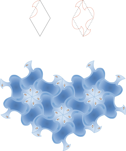 The half-sides of a quadrilateral can be rotated to the remaining half-side. Start with a quadrilateral and change half of each side, and rotate each change to the other half of that side. Form the tessellation by tracing this shape at least 18 times and shade or color alternating shapes.