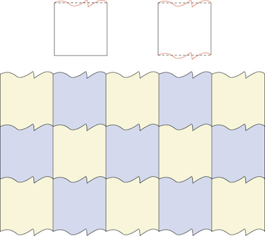 This same process can be applied to a square when two adjacent sides are changed. Start with a square and change two adjacent sides, trace the changes and translate these changes to the opposite sides as shown below. Form the tessellation by tracing this shape at least 12 times and shade or color alternating shapes.