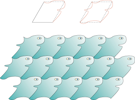 This process may be applied to a parallelogram when two adjacent sides are changed. Start with a parallelogram and change two adjacent sides, trace the changes and translate these changes to the opposite sides as shown below. Form the tessellation by tracing this shape at least 16 times and shade or color alternating shapes. Adding internal features to the tessellating shape creates a more interesting tessellation.