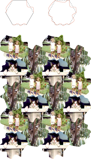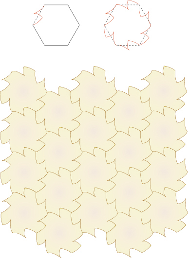 This same process can be applied to a hexagon when three adjacent sides are changed. Start with a hexagon and change three adjacent sides, trace the changes and translate these changes to the opposite sides as shown below. Form the tessellation by tracing this shape at least 18 times and shade or color alternating shapes. In this case, several internal features were added.