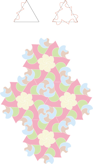 All of the half-sides of a triangle can be rotated to each remaining half-side. Start with a triangle and change half of each side, and rotate that change to the other half of that side. Form the tessellation by tracing this shape at least 18 times and shade or color alternating shapes.