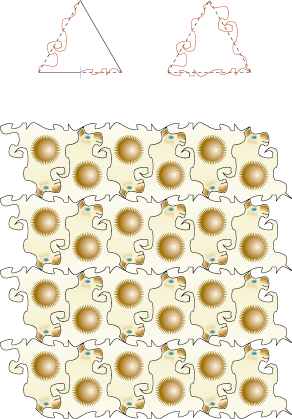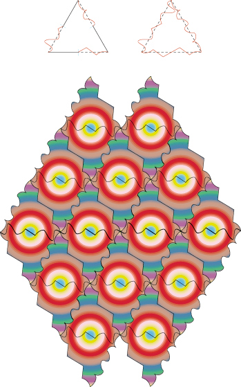 The half-sides of a triangle can be rotated to the remaining half-side. Start with a triangle and change half of one side, rotate that change to the other half of that side, and rotate the entire side to all other sides. Form the tessellation by tracing this shape at least 18 times and shade or color alternating shapes.
