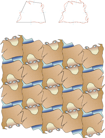 A translation is a movement is a specific direction, without turning or reflecting. Use a tessellation tracer to draw a square, make a change to one of its sides and use tracing paper to copy the modified square. Slide the original paper so that the change is translated to the opposite side and copy it, as shown below right. Use a new sheet of tracing paper to copy this shape until at least 12 shapes are traced. Shade or color the tessellation as shown below.