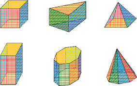 A polyhedron is composed of polygons connected at their edges so as to enclose space. There are many different solid shapes that are polyhedra. Examine the shapes below and count the number of faces, edges, and vertices for each. Place your results in the table below and look for a relationship between the number of faces, edges, and vertices. Describe this relationship in a formula using the letters F, E, and V.